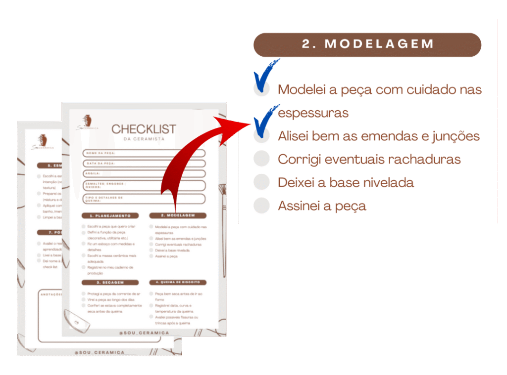 Este checklist prático foi criado para acompanhar você desde o momento de abrir a argila até a finalização da sua peça. Com ele, você visualiza cada etapa da produção e evita pular fases importantes — como o tempo de secagem ou a escolha da queima. Ideal para imprimir, deixar visível no seu espaço criativo e ter muito mais segurança no dia a dia da cerâmica.
