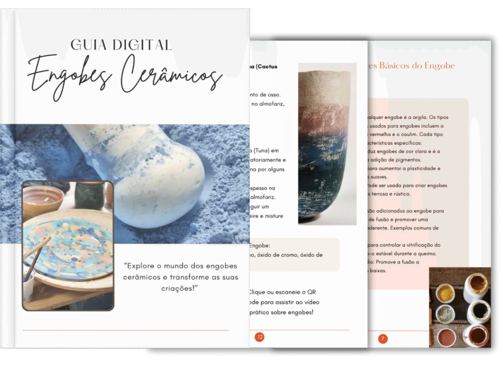 Um material completo e direto ao ponto para quem deseja dominar a técnica dos engobes e levar suas peças para um novo nível de acabamento. O Guia explica a diferença entre engobes, óxidos e esmaltes, ensina aplicações, receitas, cuidados e ainda apresenta técnicas como pincel, imersão, esgrafito, pulverização e texturização com fotos e explicações. Indispensável para quem quer personalizar peças com cor e textura antes mesmo da esmaltação.