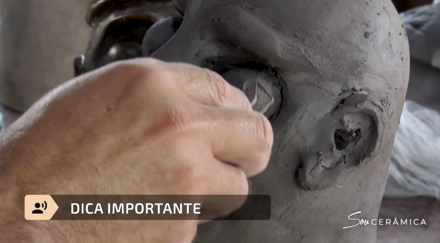 O professor mostra como construir uma escultura figurativa passo a passo, começando pela base (pescoço e cabeça), seguindo para a união das partes e finalizando com a construção dos detalhes do rosto, como olhos, nariz, boca, barba e cabelo.
